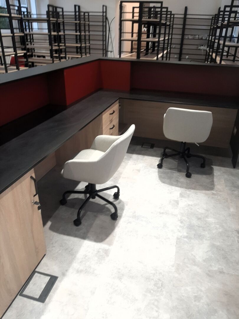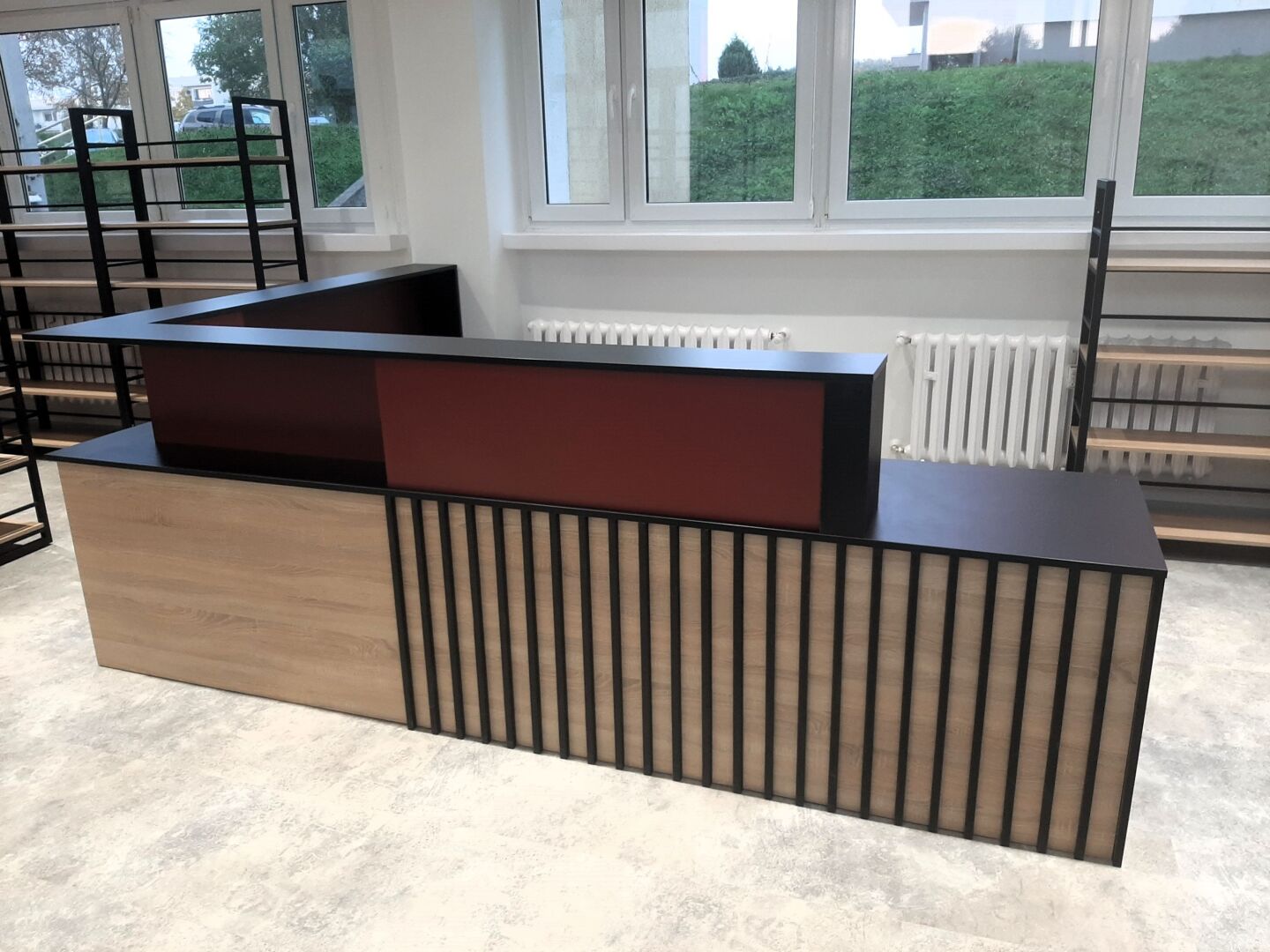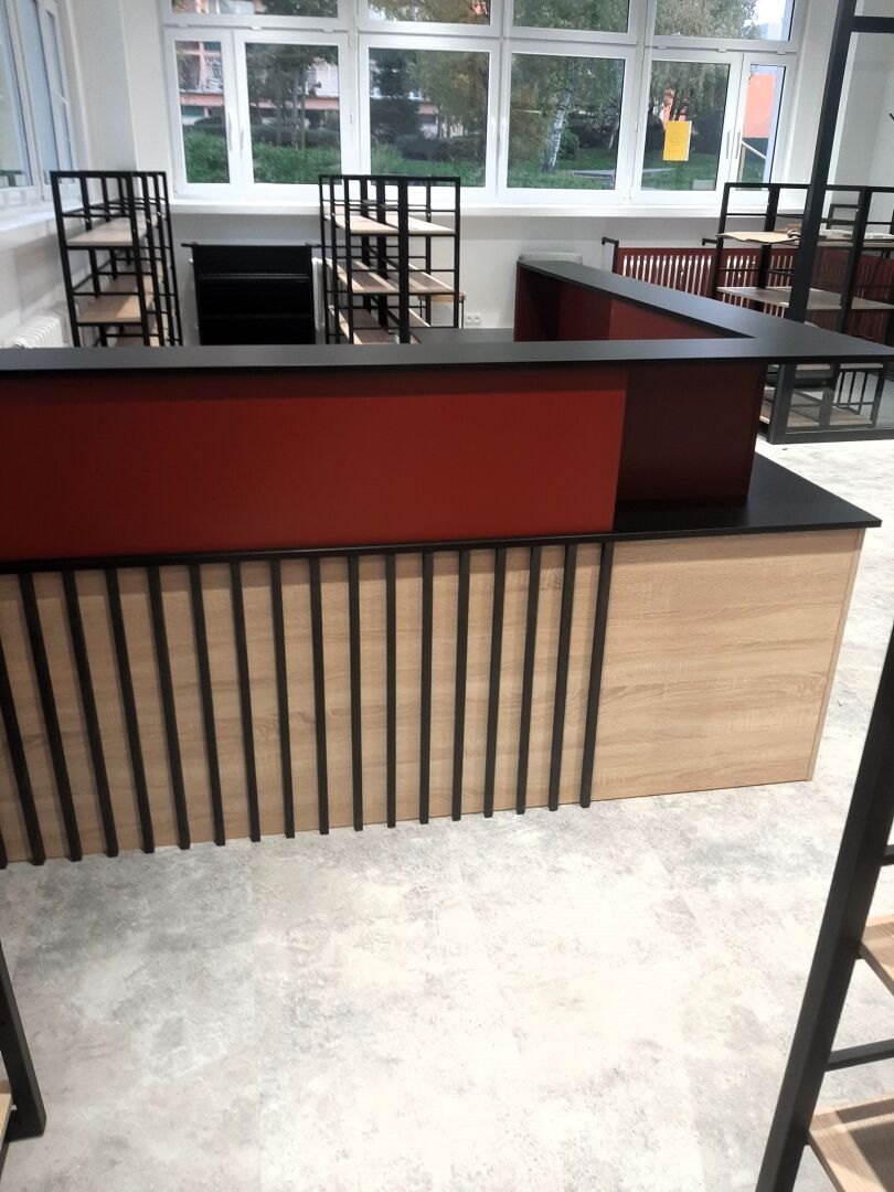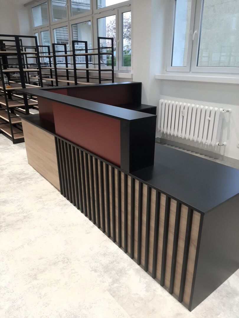 Nadstawka będzie przeznaczona głównie dla interesantów, a niższa część dla pracowników. Tego typu rozwiązanie ułatwi proces wypożyczania książek. Górny front składa się z trzech części. Każda z nich to bordowa płyta.