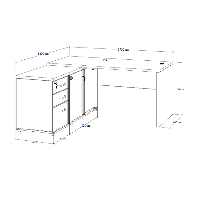 Biurko Gabinetowe z kontenerem 3 szuflady oraz szafką z drzwiami przesuwnymi 1700/1400/800. Biurko Narożne Lewe z blatem grubości 36 mm. Solidne, przestronne biurko o podwyższonym standardzie wykonania z dodatkowym miejscem do przechowywania.