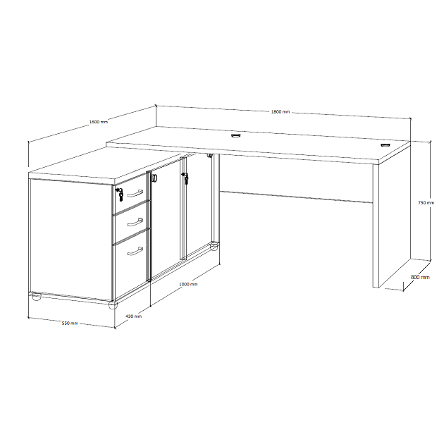 Biurko Gabinetowe z kontenerem 3 szuflady oraz szafką z drzwiami przesuwnymi 1800/1600/800. Biurko Narożne Lewe z blatem grubości 36 mm. Solidne, przestronne biurko o podwyższonym standardzie wykonania z dodatkowym miejscem do przechowywania.